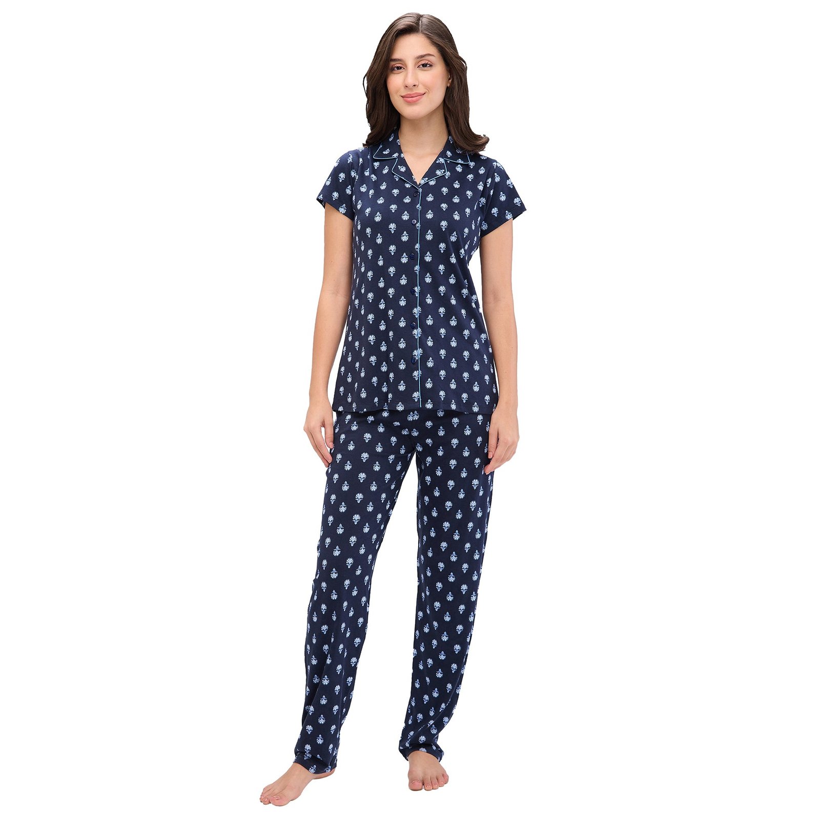Juliet Women’s Printed Premium Cotton Shirt Pyjama Set Night Suit R-PJ-19456 Navy